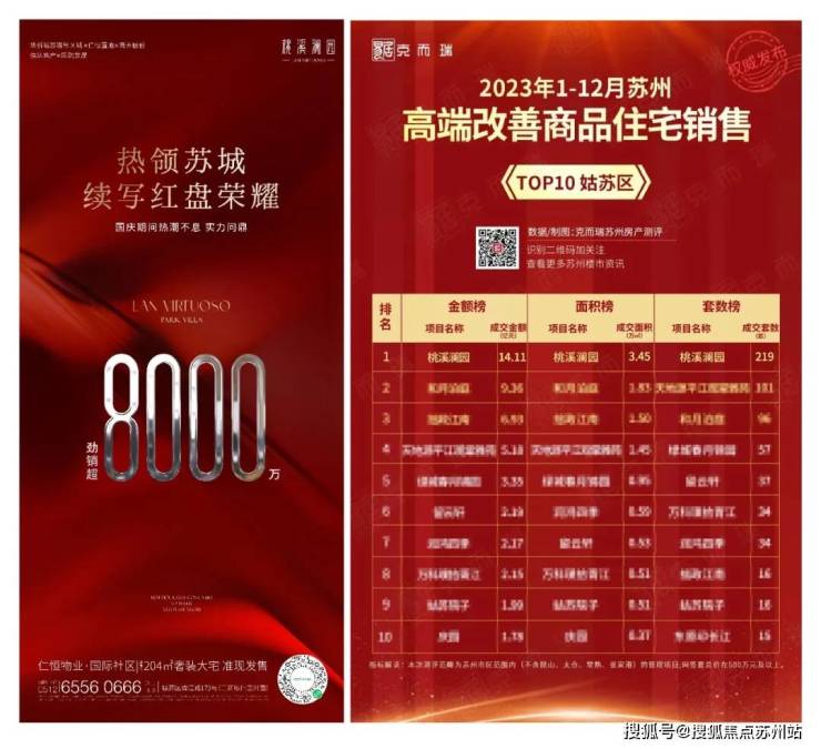 从2022年8月首次开盘至今,苏州桃溪澜园始终都以“硬核产品力”领跑市场,接连荣登姑苏区热销榜单。2023年1-12月荣膺姑苏区高端改善商品住宅销售金额、销售套数、销售面积三冠王(数据来源:克而瑞);2024年5月,即使是在市场低迷期,依然以热销11套的佳绩领傲苏州。