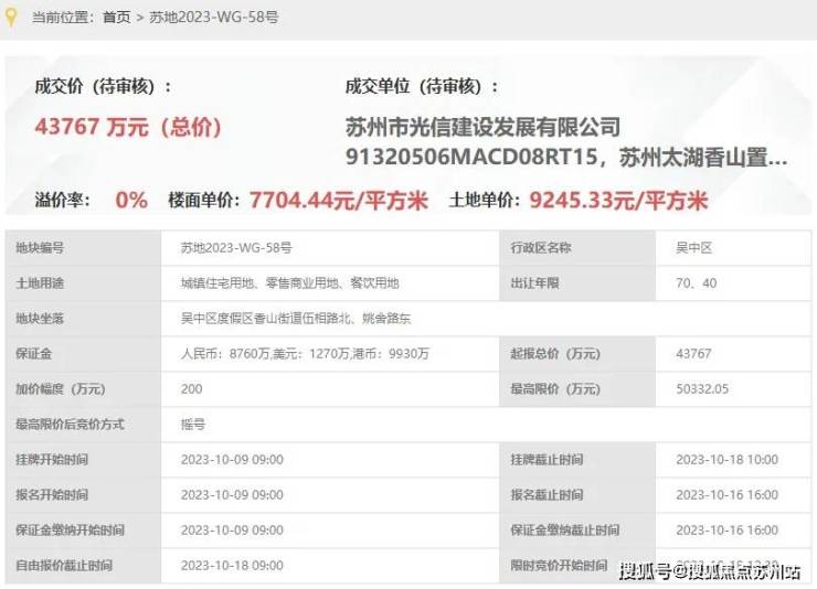 环太湖58号地块项目,即,苏地2023-WG-58号地块,位于吴中区度假区香山街道伍相路北、姚舍路东,是2023年10月18日,光信建设&太湖香山置地以底价43767万元竞得,成交楼面价7704元/平,溢价率0%。