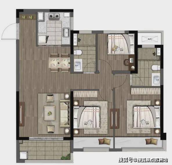 115户型,三室两厅两卫的户型设计,延伸不同家庭结构的需求.