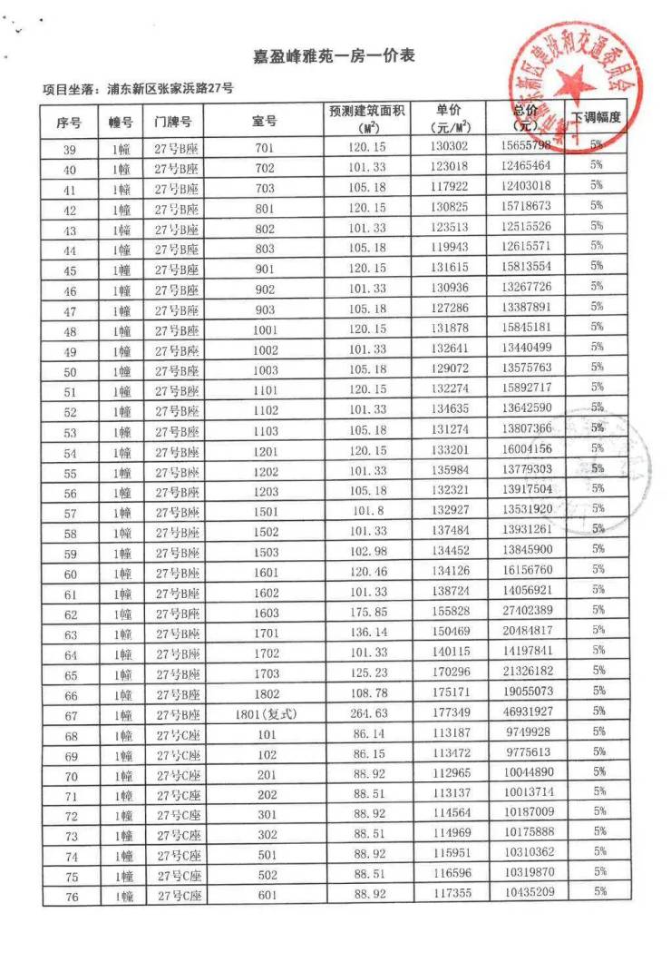 嘉盈峰一房一价表(开盘价)