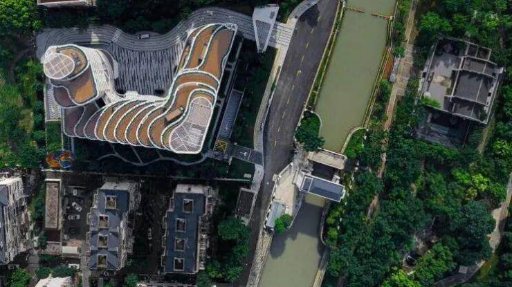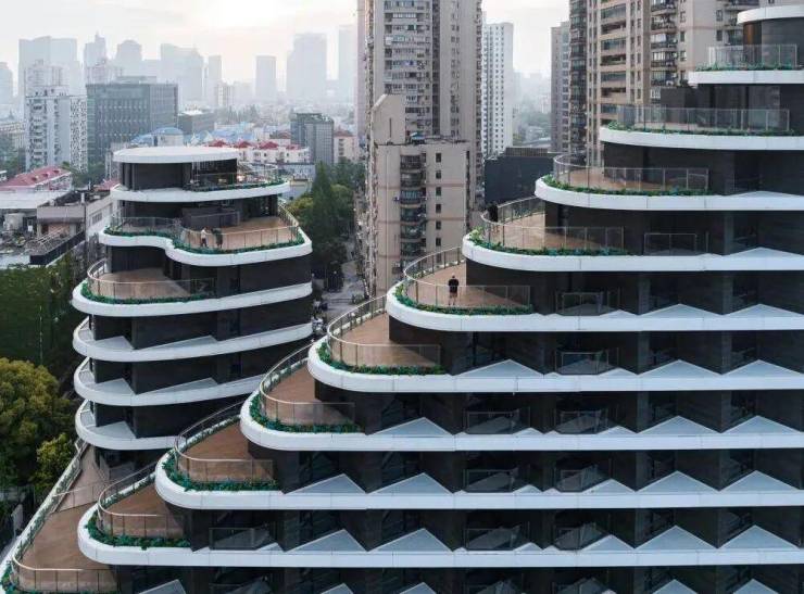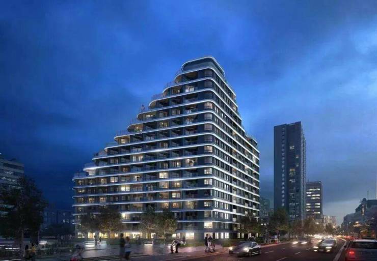 外立面采用玻璃幕墙现代简约风。建筑轮廓曲线蜿蜒,呈波浪线型层层迭高并后退,时尚感非常强。