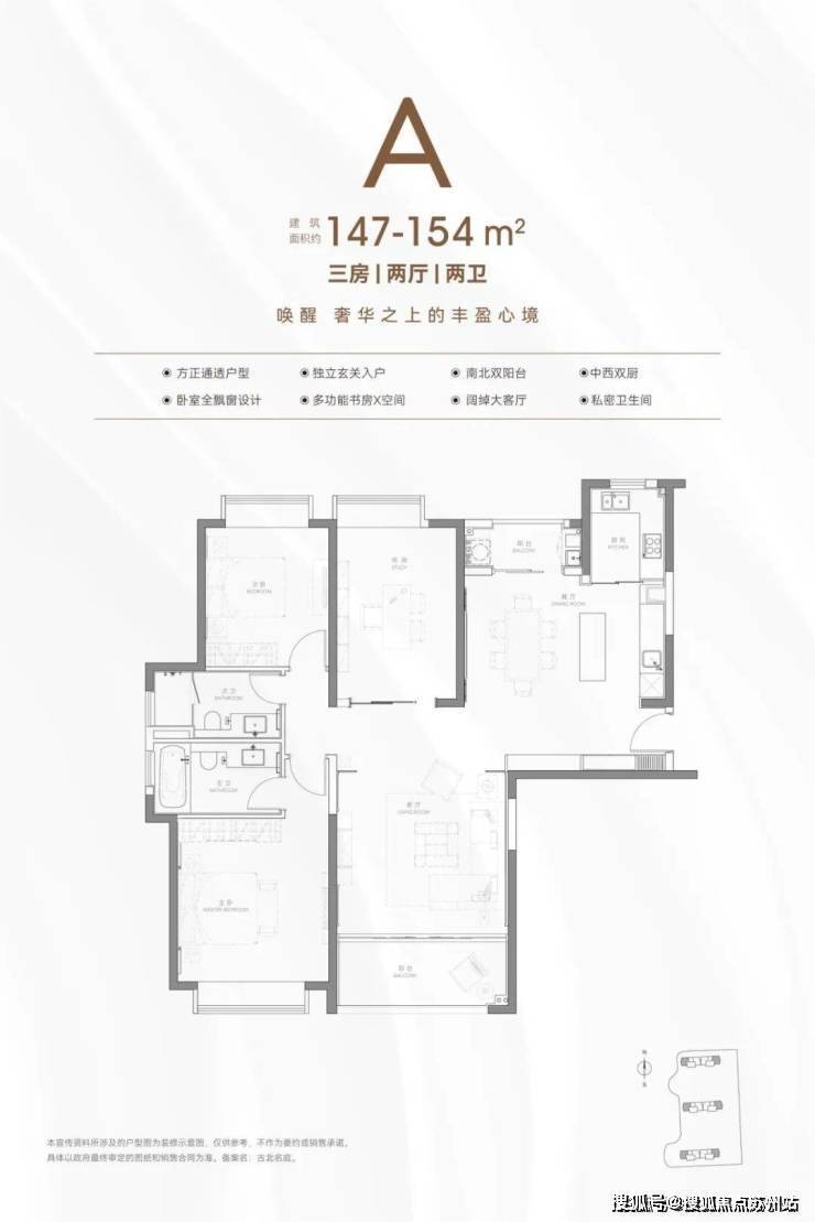 ①边套是约150㎡左右的大三房南北通户型:整个户型得房率高,基本在79%左右,每个功能区也都非常阔绰。