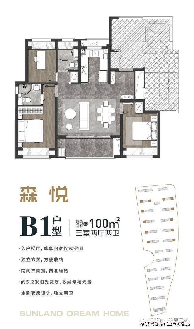 森兰·航荟名庭售楼处电话:400-8123-664【预约☎】该户型建筑面积约100㎡B1户型将客厅、餐厅、阳台、玄关等,尽可能纳入同一个大空间,约5.2米的阳光宽厅,将全家人的日常活动空间囊括其中。在创造“宽厅”概念的同时,合理的利用剩余房屋面积。