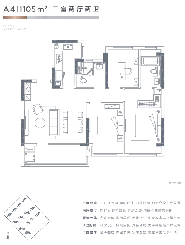 建面约105㎡起步,到220㎡大平层,刚需改善全覆盖。朗诗科技系统加持,地源热泵+表层辐射+全置换新风,四季恒温恒湿,告别空调病。