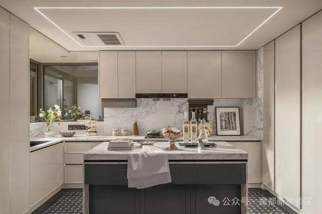 厨房更是拥有别墅级大空间,通铺中央空调、地段,甚至还有交付的奢石大岛台.