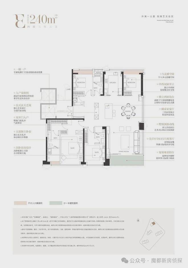 空间、尺度感频繁被提及,顶豪的起步面积习惯性设置为200㎡+,部分改善房源的四房门槛也提到了180㎡+.