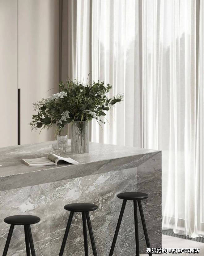 餐厅与厨房位于客厅的旁边,开放式的设计很好地利用了不大的公共空间,给人开阔的视觉感受.光线透过落地窗照入室内,让空间更加明亮.木质的圆形餐桌搭配上上方的金属吊灯,显得柔和而有质感.中岛台选用灰色大理石材质,与整体空间完美融合.