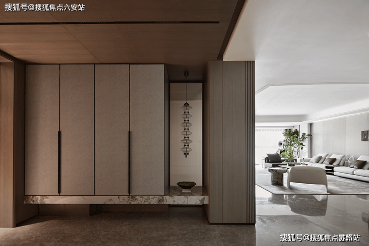玄关承载着室内外功能转换,也聚焦了家的状态,让一日奔波有了倾注而下的霎那。低饱和度木质基调开启温润柔和的生活序章,皮革柜体旁的造景空间,则为开篇创造出隐性绪言。半透玻璃屏风前垂挂下落的灯饰,让所有疲惫都宛若有了倾述的对象,在模糊的边界内,得以最终隐入那一盆微妙的山海之间。