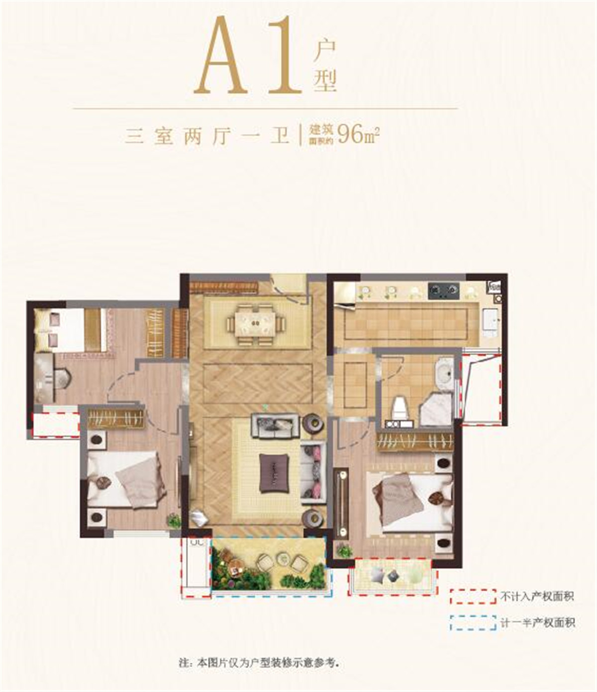 3室2厅1卫-建面约96㎡三室两厅一卫A1户型