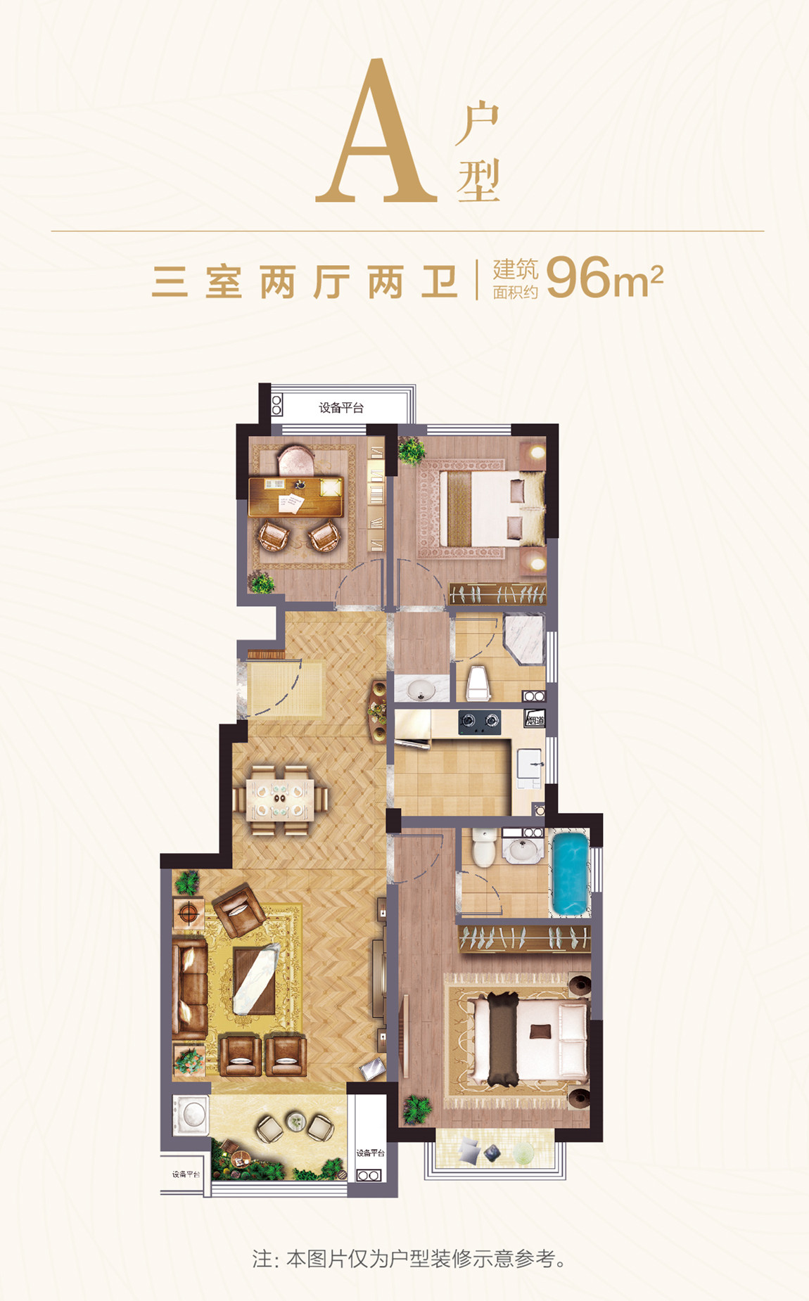 3室2厅2卫-建面约96㎡三室两厅两卫A户型
