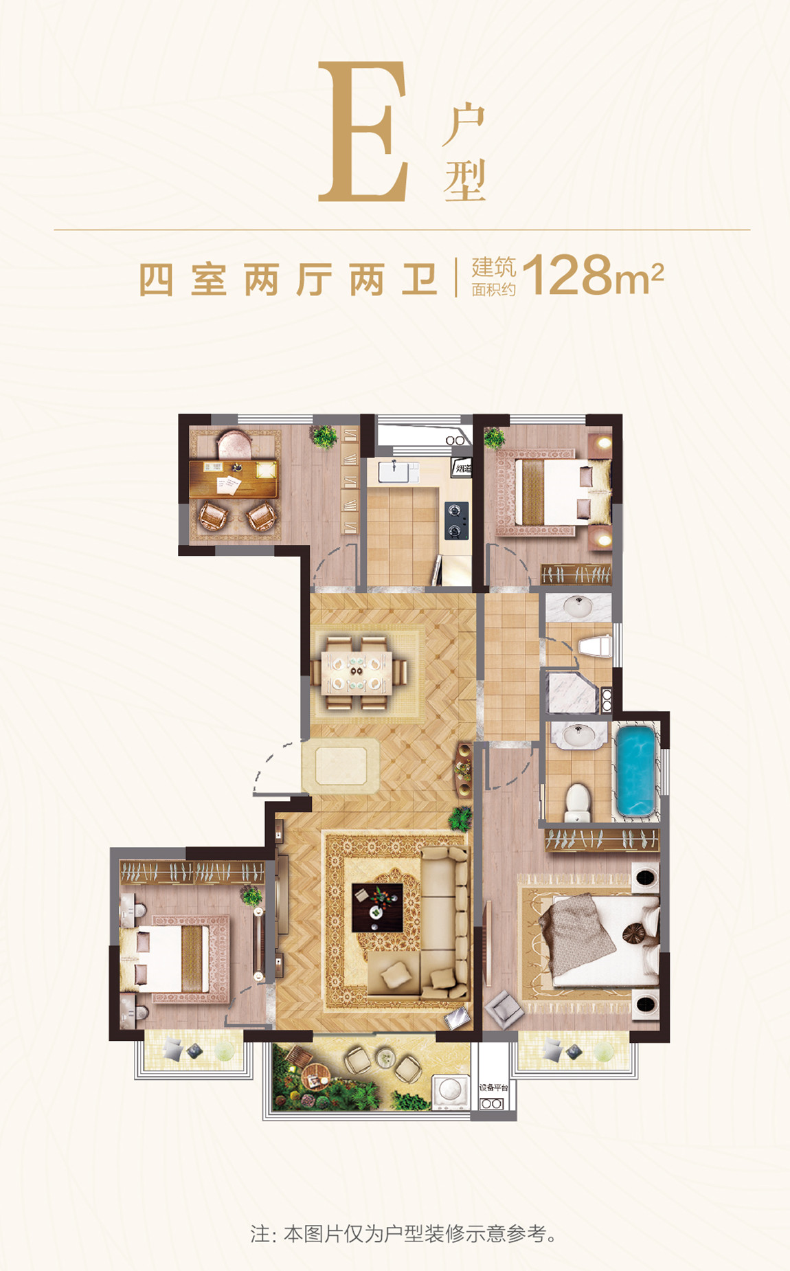 4室2厅2卫-建面约128㎡四室两厅两卫E户型
