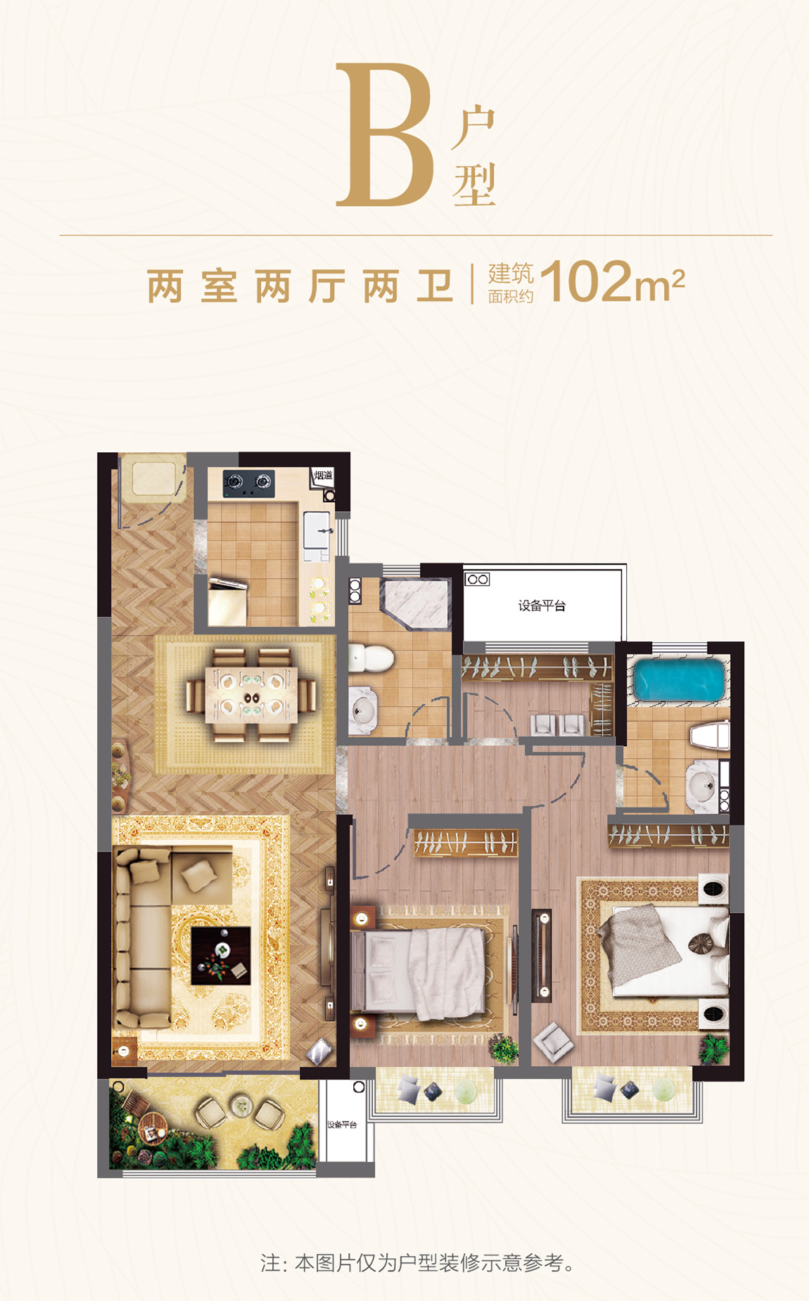 2室2厅2卫-建面约102㎡两室两厅两卫B户型