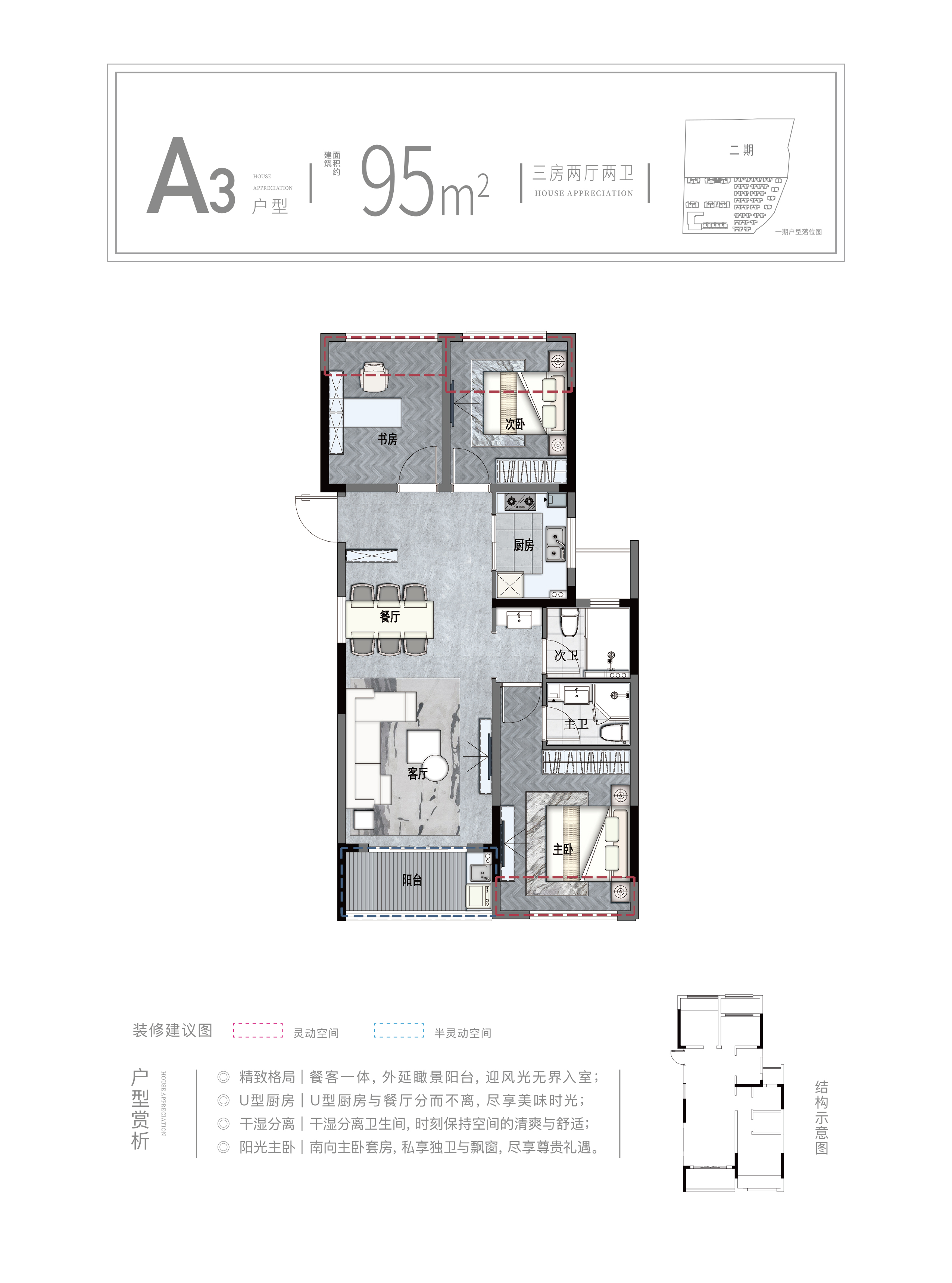 3室2厅2卫-建面约95㎡ 中间套 A3户型