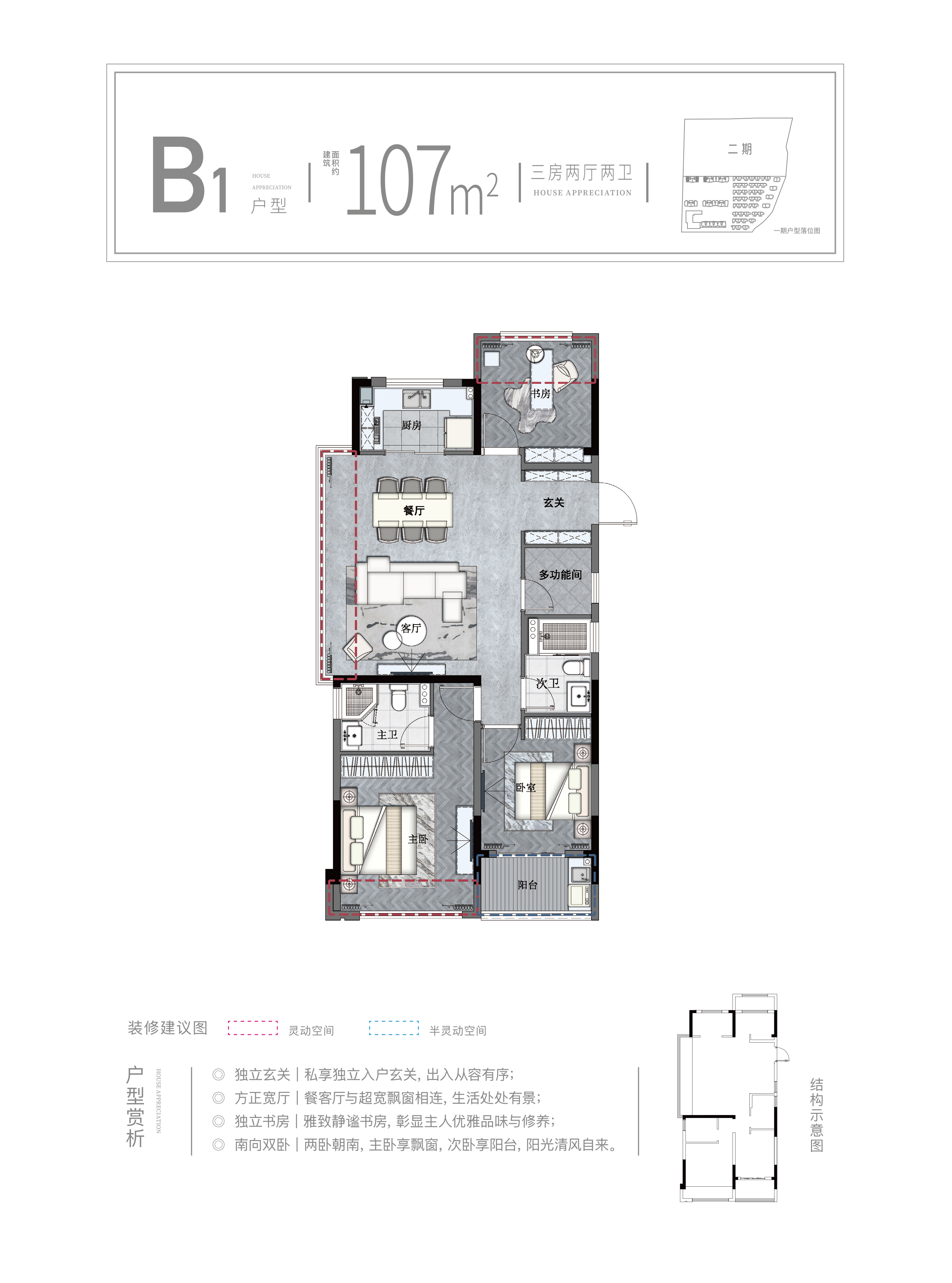 3室2厅2卫-建面约107㎡ 边套B1户型