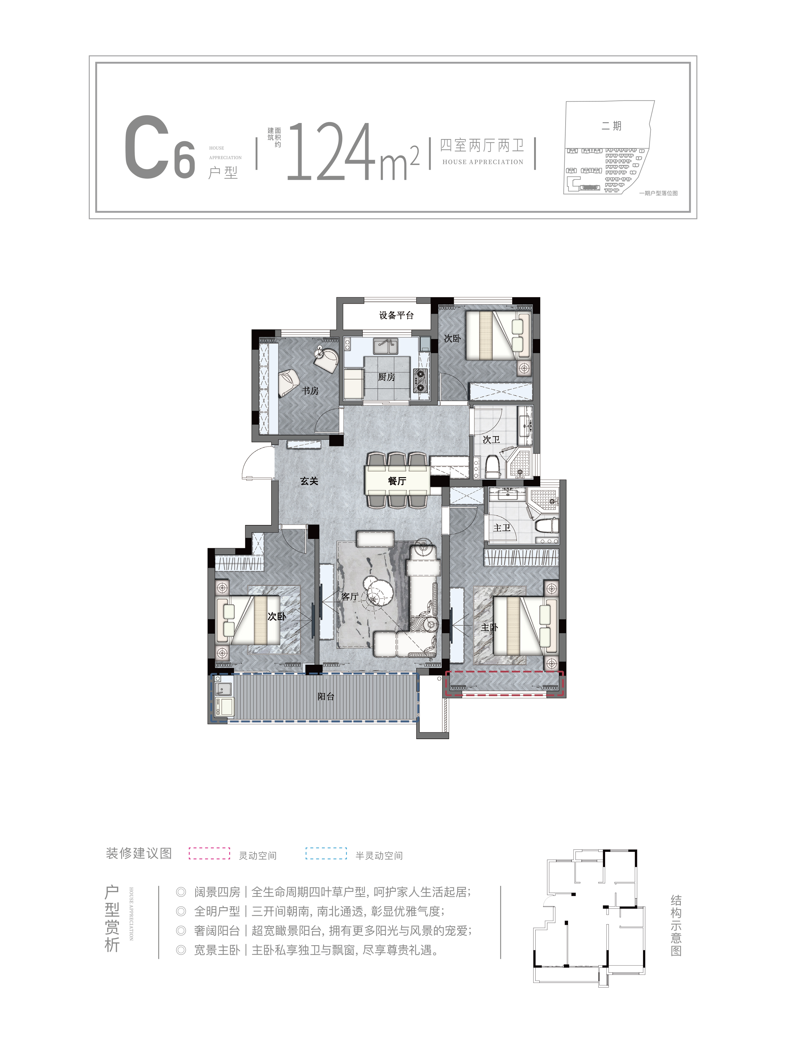 4室2厅2卫-建面约124㎡中间套C6户型