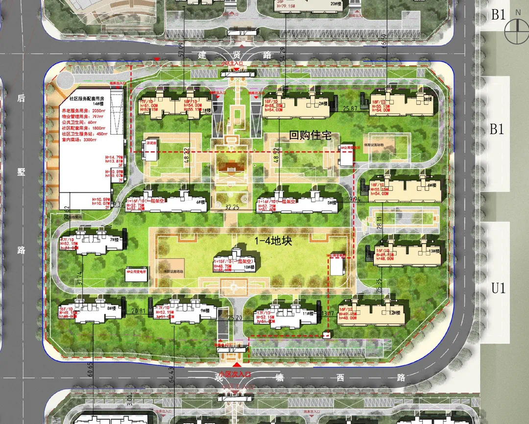 1、湖东1-4地块内需配建建筑面积不少于1800平方米的社区用房,不少于2050平方米的居家养老服务用房,不少于450平方米的社区卫生服务站,不少于60平方米的公厕,以上配建用房建成后无偿移交相关主管部门,同时配建不少于3300平方米的室内菜场(整体产权),所有配建用房沿北侧建贤路集中布置,设置独立出入口。