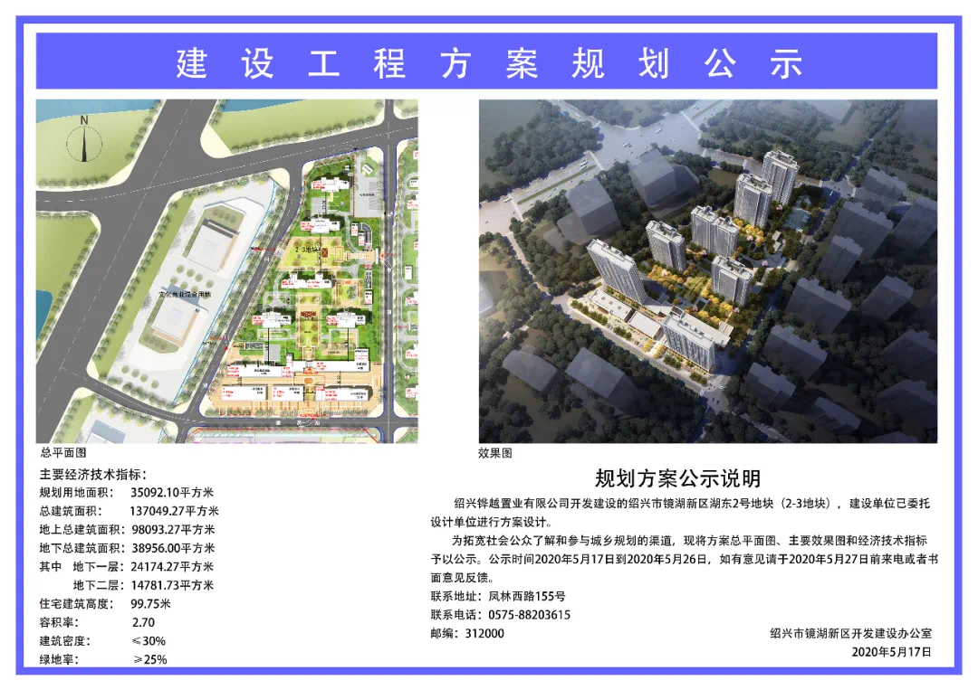 5 月 17 日,市自然资源和规划局发布一则关于《绍兴市镜湖新区湖东2号地块(2-3地块)规划设计方案公示》。