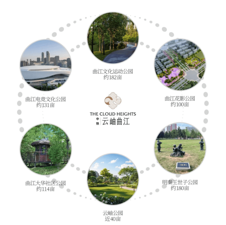 中铁·云岫曲江,1公里范围里汇集曲江文化运动公园、曲江电竞文化公园、曲江花影公园、曲江大华社区公园、云岫公园、明秦王世子公园6大公园,近千亩生态公园围合之地,占据生态公园核芯位,奢享被绿意环抱的日常,重获生命本真的平和。