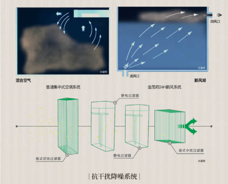 24小时新风置换系统+四级过滤24小时提供置换新风,新风出口设置在房间底部在通过人体、电器等热源加热后,带动污浊空气向上转移。通过设置在顶面回风口排出房间构成良好的空气气流组织形式,有效去除室内浑浊空气。金茂住宅新风机组内设除霸+初效+静电+中效构成的四级过滤过滤效率理论值达到8596,营造清新呼吸的“室内氧吧”