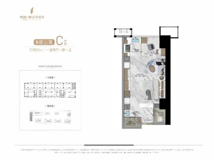 公寓产品中,A栋公寓为一栋约140米高、42F的超高层产品,其中33—42F打造的是建面约500㎡的总裁公寓,产品共计有30多套,单层层高3.9米,客厅挑空7.8米,一梯一户,一层两户,独享五星级入户大堂,2—32F则是约50—161㎡、 4T24户的平层公寓产品。B栋公寓为建面约50—129㎡、6T23户平层产品;C栋公寓为建面约80—120㎡、 4T12户平层产品。