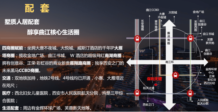 商业配套:附近有金辉广场购物中心、曲江银泰百货、航天城壹街区、星座广场