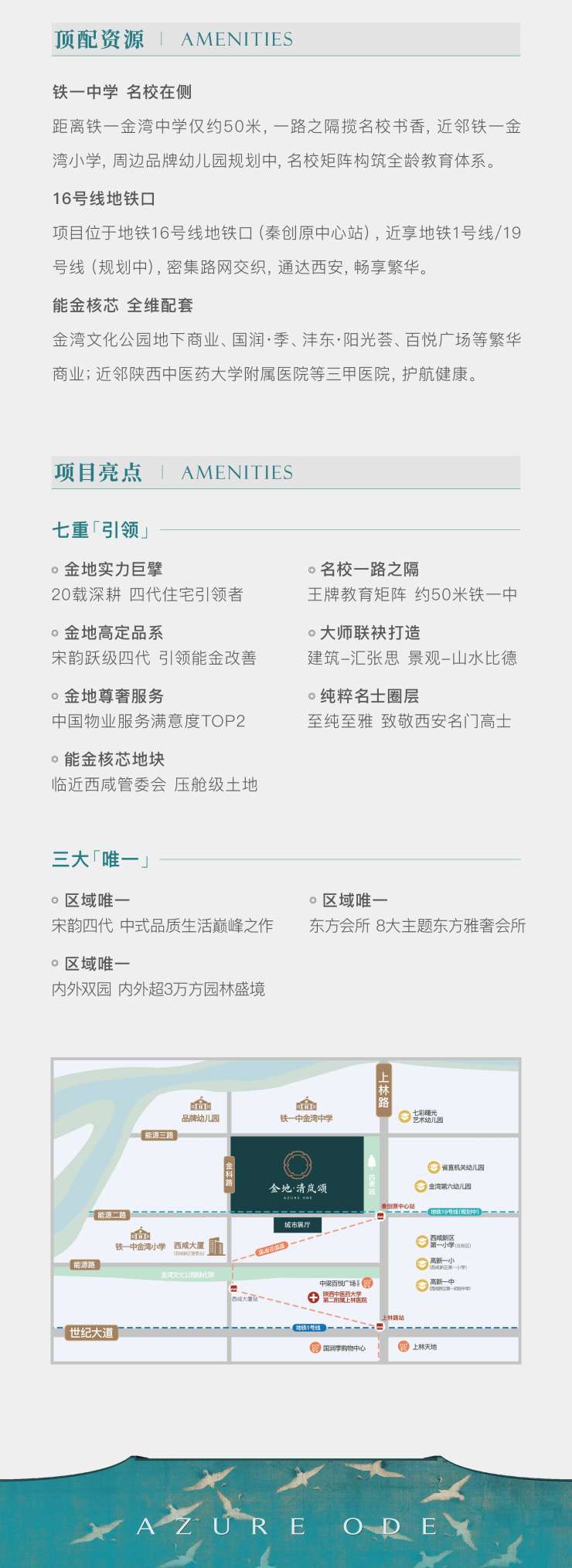 铁一学区之内,15年精英教育。项目北侧约50米为铁一中金湾中学(已开学),约800米铁一金湾小学(已开学)。项目东侧约400米公立幼儿园(规划中)。