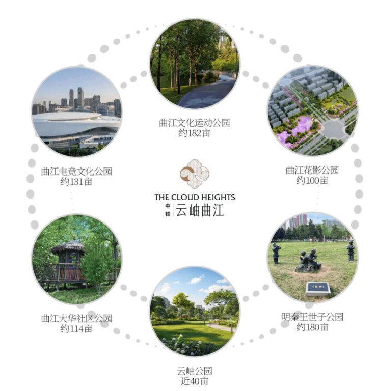 中铁·云岫曲江,1公里范围里汇集曲江文化运动公园、曲江电竞文化公园、曲江花影公园、曲江大华社区公园、云岫公园、明秦王世子公园6大公园,近千亩生态公园围合之地,上据生态公园核芯位,奢享被绿意环抱的日常,重获生命本真的平和。