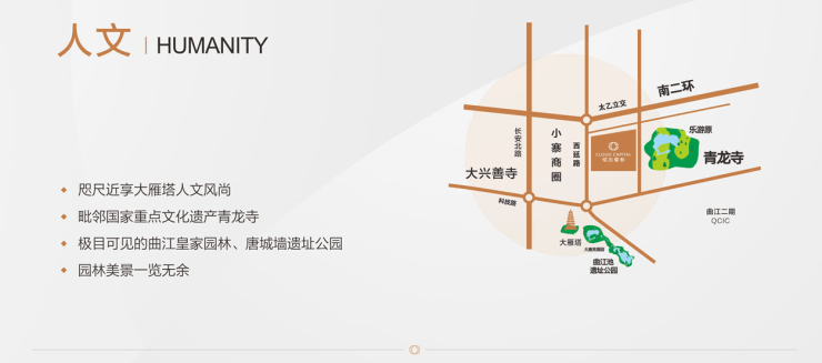 【景 点】项目东侧的青龙寺公园,是佛教八大宗派之一的密宗祖庭所在地,1986年,从日本引进千余株樱花树植于寺院,每年三月底,13个品种600多株樱花竞相开放,吸引着众多的中外游客。此外,位于项目南侧的曲江遗址公园、大唐芙蓉园等也是西安的必游览景点。