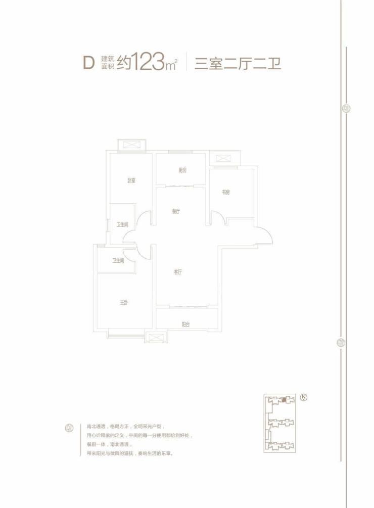 户型5(D)单套建筑面积约123㎡,三室二厅二卫;