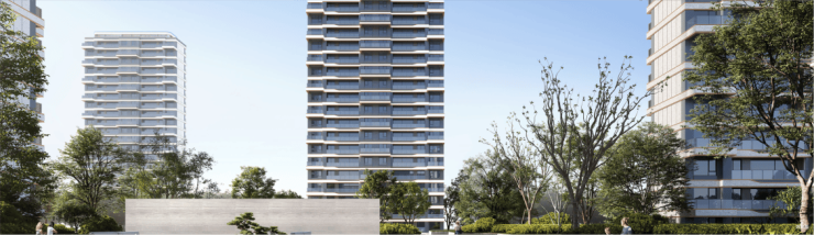 项目汲取中国传统建筑中飞檐的经典形态,融入Burberry奢侈品经典纹路,以具有公建化风格的建筑美学,让第四代住宅建筑崭露于绿意围合之中,结合建筑间前后错位、高低错落的排布,建构富有动感与肌理的、绵延起伏的建筑天际线,回应城市与自然的双重向往。