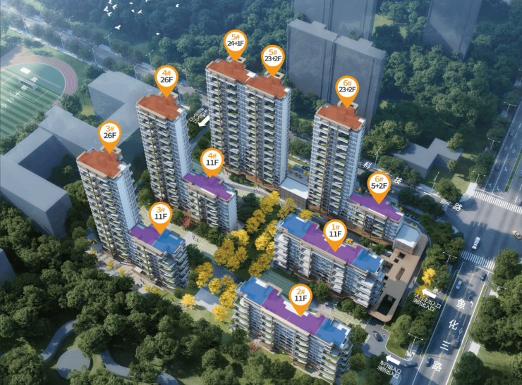 楼层状况:纯T2产品 高层:24-26F 洋房:5-11F