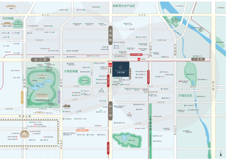 【交通】二环金腰带,大明宫、浐灞、城东三区交汇北辰大道、广安路、广云潭大道、东北二环自由切换,一横一纵30余条公交线路通达全城双地铁加持,紧邻地铁3号线辛家庙站,距8号线广泰门站约1km,为美好生活提速