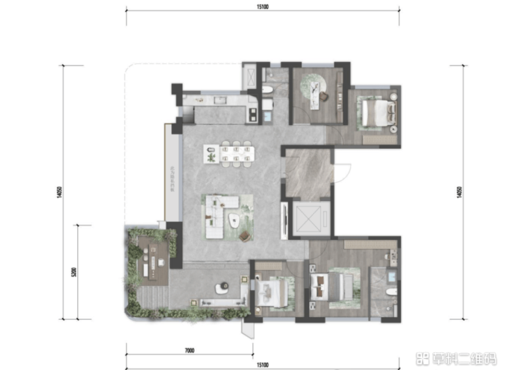 改善型四房设计,约30-32㎡观景露台,约5㎡私享入户前厅,约23㎡酒店式套房主卧,约114-118%实享空间。居项目中庭,尽揽高定中庭景观,尊享臻贵景观资源