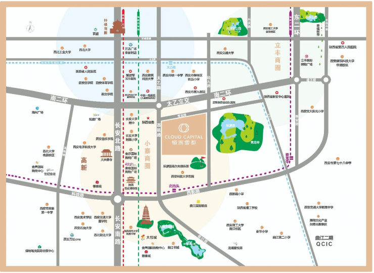 【交 通】区域纵线由西向东分别由长安北路、西延路、东二环、经九路组成,其中长安北路作为城市中轴道路,贯穿城市核心;横线由北向南依次是南二环、西影路、南三环,其中位于项目北侧的南二环通达全城,而项目南侧的西影路接驳城东、城南,大大节省出行时间。项目距离地铁3号线北池头站直线距离仅500米,4号线后村站就位于项目西侧、5号线太乙路站距离项目仅800米。环绕本项目周边站点有北侧的青龙路、经九路站,项目西侧直线距离约300米的乐游原公交站,距项目东侧800铁一中公交站点,数十条公交线路交汇。