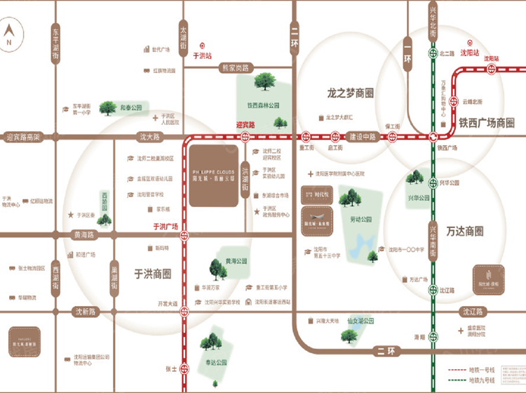 项目北临近迎宾路地铁口,南临于洪广场地铁口,1.5公里能找到2个公园(黄海公园,铁西森林公园)作为项目业主晨练和散步的较佳去处, 7个银行营业厅,多条公交线路,中小学,办事大厅,步行可达区域全部配套,便利生活一步可达。