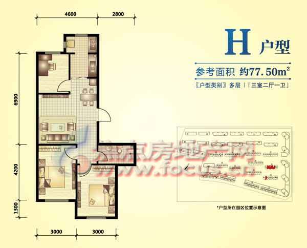 3室2厅1卫-益格名邸三室二厅一卫约77.5平方米