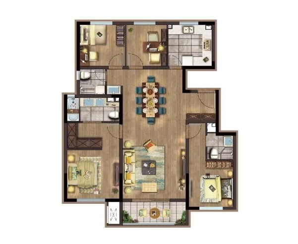 我选的是140这个户型,南向双套房一共4个卧室,两个干湿分离的卫生间,还有个超级大的客厅,全家能生活在一起。还是南北通透,所有屋都可以保证空气流通,减少病菌感染生病。