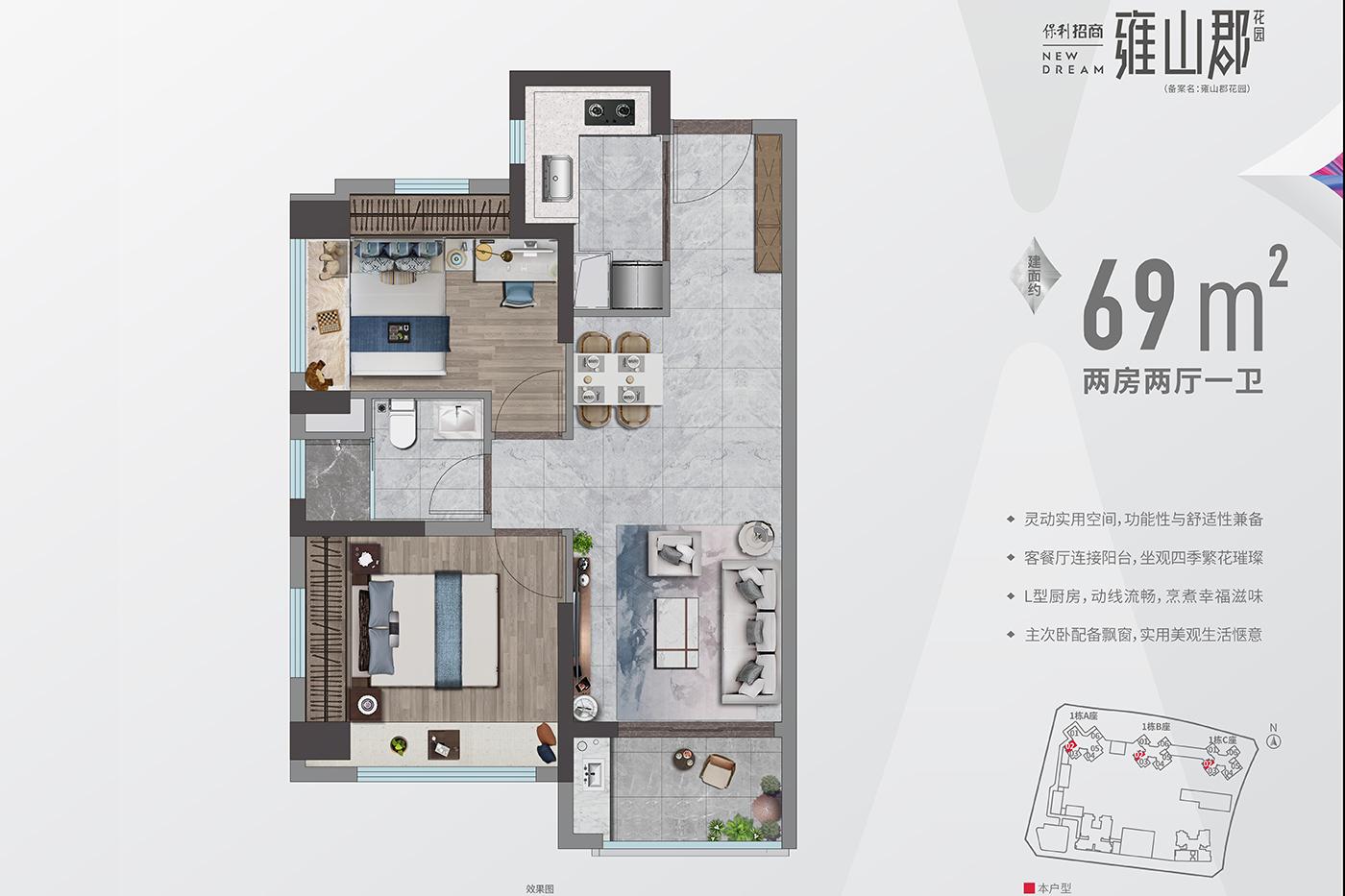 保利招商雍山郡共6栋,其中1A为46层、1B为46层、1C为47层。1E为商寓总6层、ID为安居房总49层、1F为自持物业总32层。总户数1592户(商品住宅759户,保障性住房369户,自持租赁464套)。