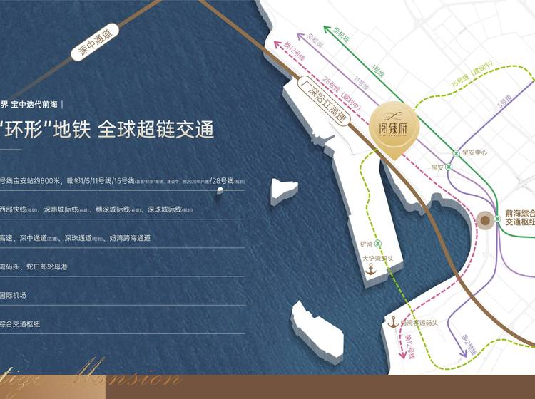 首条“环形”地铁 全球超链交通 5地铁:距地铁11号线宝安站约800米,毗邻地铁1/5/11号线/15号线(首条“环形”地铁,建设中)/28号线(规划中) 4城轨:深港西部快线 (已规划) 、深惠城际线(在建)、穗深城际线(在建)、深珠城际线(已规划) 3高速:沿江高速、深中通道(在建)、深珠通道(已规划) 2码头:大铲湾码头、妈湾客运码头 1枢纽:前海综合交通枢纽