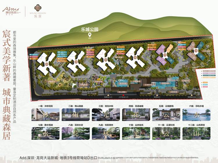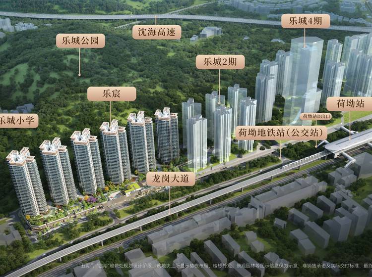 项目主打“公园基因+酒店美学+艺术雅奢”,依托双地铁(3号线荷坳站、14号线坳背站)、双城际(深大、深惠城际),高效连接深圳核心区与大湾区。周边坐拥45万㎡乐城公园及桐基山公园,强调生态健康与高端居住体验,引入全龄园林、无界架空层、星级入户大堂等品质设计。