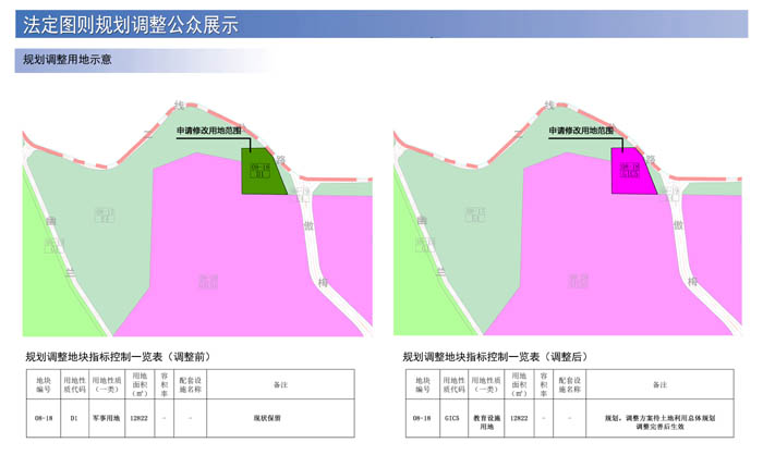 原规划中,该地块用地性质为军事用地(D1),用地面积约12822平方米,备注为现状保留,此次将该地块用地性质调整为教育设施用地(GIC5),备注调整为“规划,调整方案待土地利用总体规划调整完善后生效”,其它内容不变。