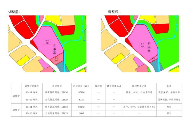 05-11地块用地面积为57416平方米,规划用地性质为教育科研用地(GIC5),规划配套设施“高中、初中、社会停车场”,备注“现状保留,华侨中学”。规划调整后,该地块用地面积为63142平方米,用地性质,规划配套设施“高中、初中、社会停车场(库)”,备注调整为“规划”,其他保持不变。