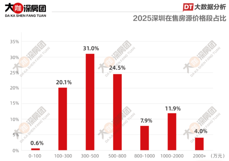 总价段方面,目前在售二手房中占比最高的是300-500万元,占比31.0%。