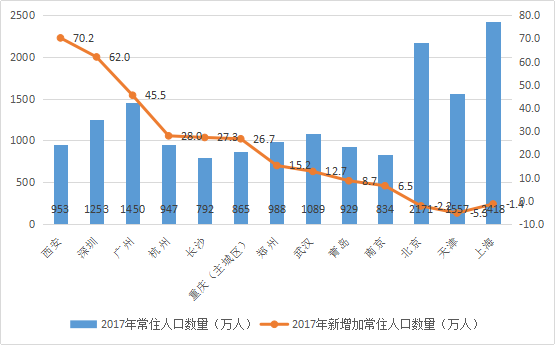 2017年,“网红”城市西安新增常住人口70.2万人,高居各城市之首,而深圳以60.0万屈居第2位,广州以45.5万位列第3。西安在抢人方面屡放大招,网上各种段子流传,吃瓜群众表示“刷新三观”。