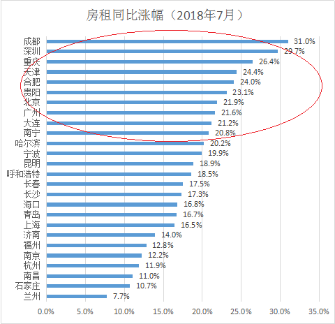 尽管北京人气旺、房租贵,但数据显示,2018年7月北京月房租上涨21.9%,涨幅并不是较高的,甚至连前5位都不是。