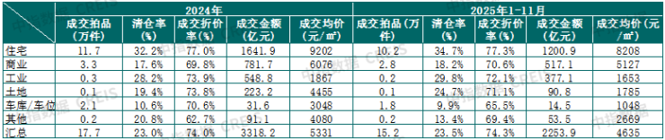 表:2025年1-11月各类法拍房挂拍套数及成交金额