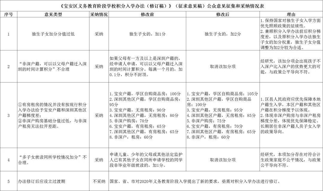 2020年1月3日,宝安区教育局公示了公众意见采纳情况。