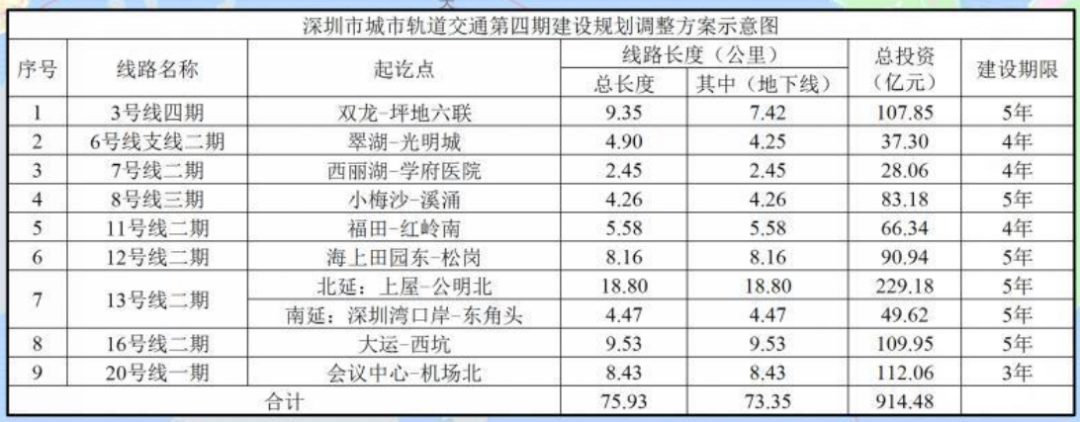 3号线四期工程调整、6号线支线二期工程自翠湖站(原荔林站)至光明城站、12号线二期工程自海上田园东站至松岗站、13号线二期,含北延段和南延段、16号线二期工程自大运站至西坑站、7号线二期自西丽湖站至学府医院站、8号线三期自小梅沙站至溪涌站、11号线二期自福田站至红岭南站、20号线一期自会议中心站至机场北站。