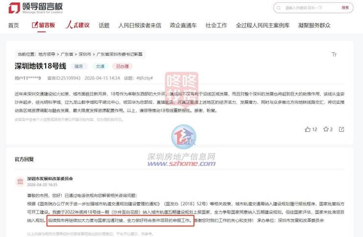 对此,深圳市发展和改革委员会正式作出回应:“我委于2022年底将18号线一期(沙井至白花段)纳入城市轨道五期建设规划上报国家,全力争取国家同意纳入五期建设规划。但经国家评估,国家未批准项目纳入规划。后续我市将继续加大力度与国家沟通对接,全力做好符合条件项目的申报工作。”