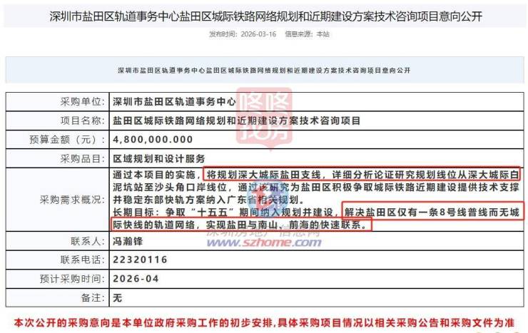 采购需求显示,通过本项目的实施,将规划深大城际盐田支线,详细分析论证研究规划线位从深大城际白泥坑站至沙头角口岸线位。长期目标是争取“十五五”期间纳入规划并建设,解决盐田区仅有一条8号线普线而无城际快线的轨道网络,实现盐田与南山、前海的快速联系。